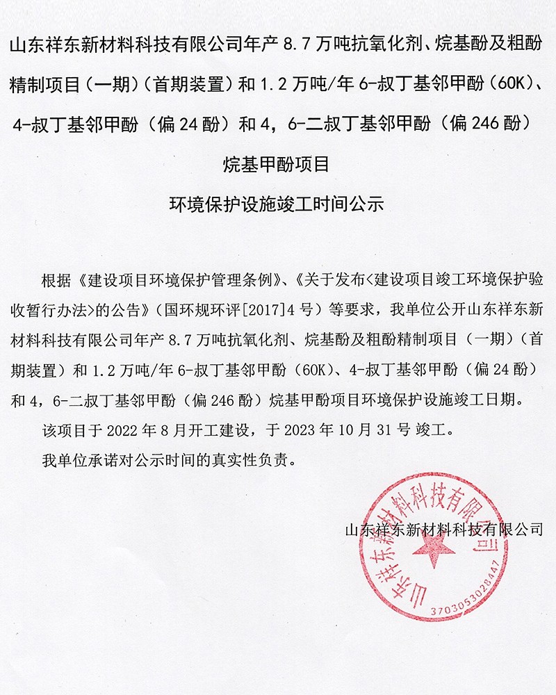 烷基甲酚項目環(huán)境保護設(shè)施竣工時間公示